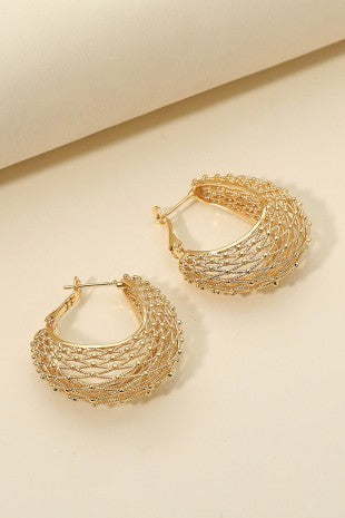 These textured metal filigree beaded hoop earrings feature an intricate crisscross design with delicate bead accents for a striking textured look. Perfect for adding dimension and elegance to any outfit, they balance bold style with refined detail, making them a standout choice for everyday glamour.