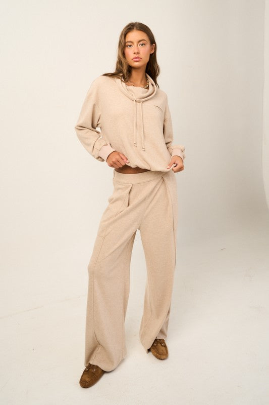 This relaxed cowl-neck pullover features adjustable drawstrings and dropped shoulders, ensuring a comfortable, effortless fit. Its soft drape enhances wearability throughout the day, while the subtle minimal chest detail adds a refined, contemporary touch. Ideal for layering or casual wear, this piece combines comfort with understated style.