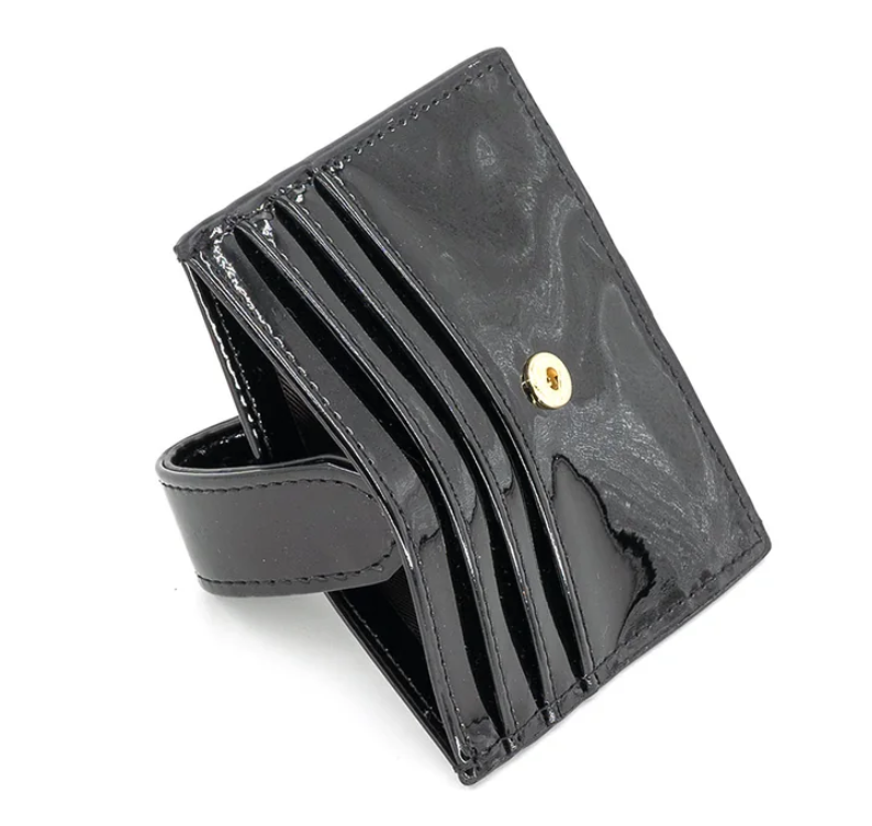 Crafted from high-quality faux patent leather, this double-sided card holder offers a sleek and professional way to organize your credit cards. Its durable construction ensures long-lasting use while the compact design fits easily in pockets or small bags. Perfect for those seeking a minimalist yet stylish solution to keep essentials accessible and protected.