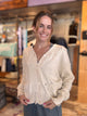 Mineral washed denim long sleeve top featuring a V-neckline, pleated long sleeves, added seams throughout for detail, two side slits, a frayed bottom hem and is a slightly boxy silhouette.