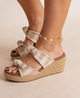 These black platform sandals combine bold style with modern comfort. The design features dual woven straps, accented with gold-tone studs and a chic buckle for a touch of elegance. The thick, braided platform sole provides added height and a textured, contemporary look while ensuring stability and comfort. Perfect for casual outings or elevating a minimalist outfit, these sandals pair effortlessly with jeans, dresses, or shorts. Slip into these versatile sandals for a stylish and confident statement.