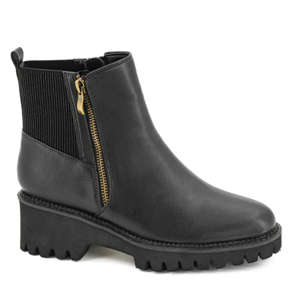 Tough, sleek, and ready for anything—Take a Hike in black is your go-to boot for unstoppable style. The smooth faux leather finish is paired with a chunky lug sole for grip and comfort, while the ribbed stretch panel and gold side zipper make slipping in and out a breeze. Perfect for city strolls or weekend adventures, these boots keep your look effortlessly cool while giving you all-day wearability.