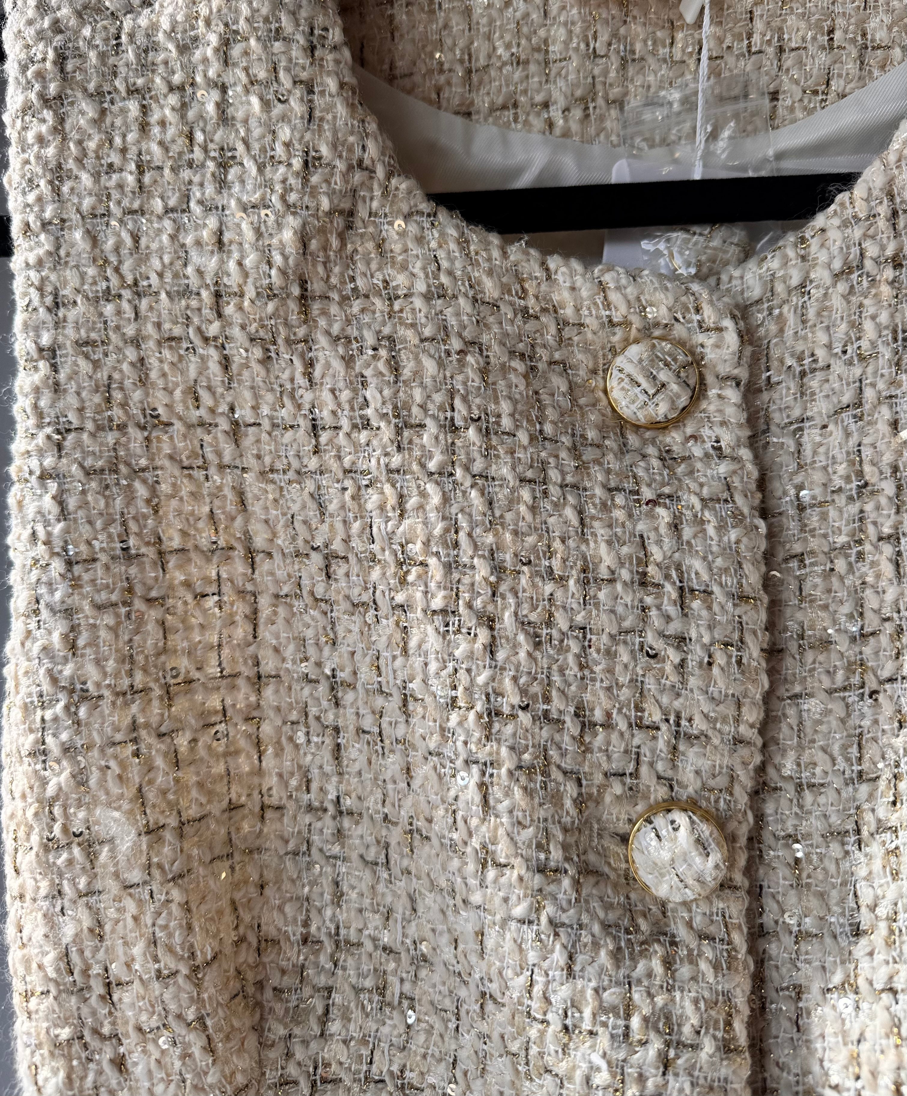 This tweed vest features a sophisticated button detail with gold-rimmed accents and a belted waist for a tailored silhouette. Crafted to combine classic texture with refined hardware, it offers structured elegance suitable for layering in professional or polished casual ensembles.