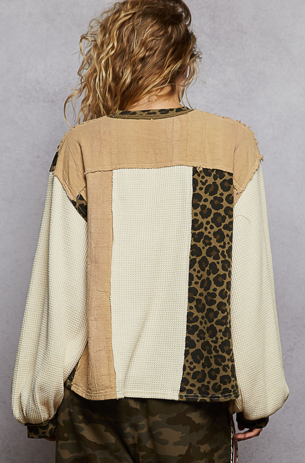 This relaxed-fit top features a round neckline and balloon sleeves, crafted from a thermal and mixed material blend for comfort and warmth. The standout animal print contrast adds a stylish edge, making it a versatile piece suitable for both casual wear and layered outfits. Its thoughtful design balances fashion with functionality, ideal for those seeking both comfort and distinctive style in cooler seasons.