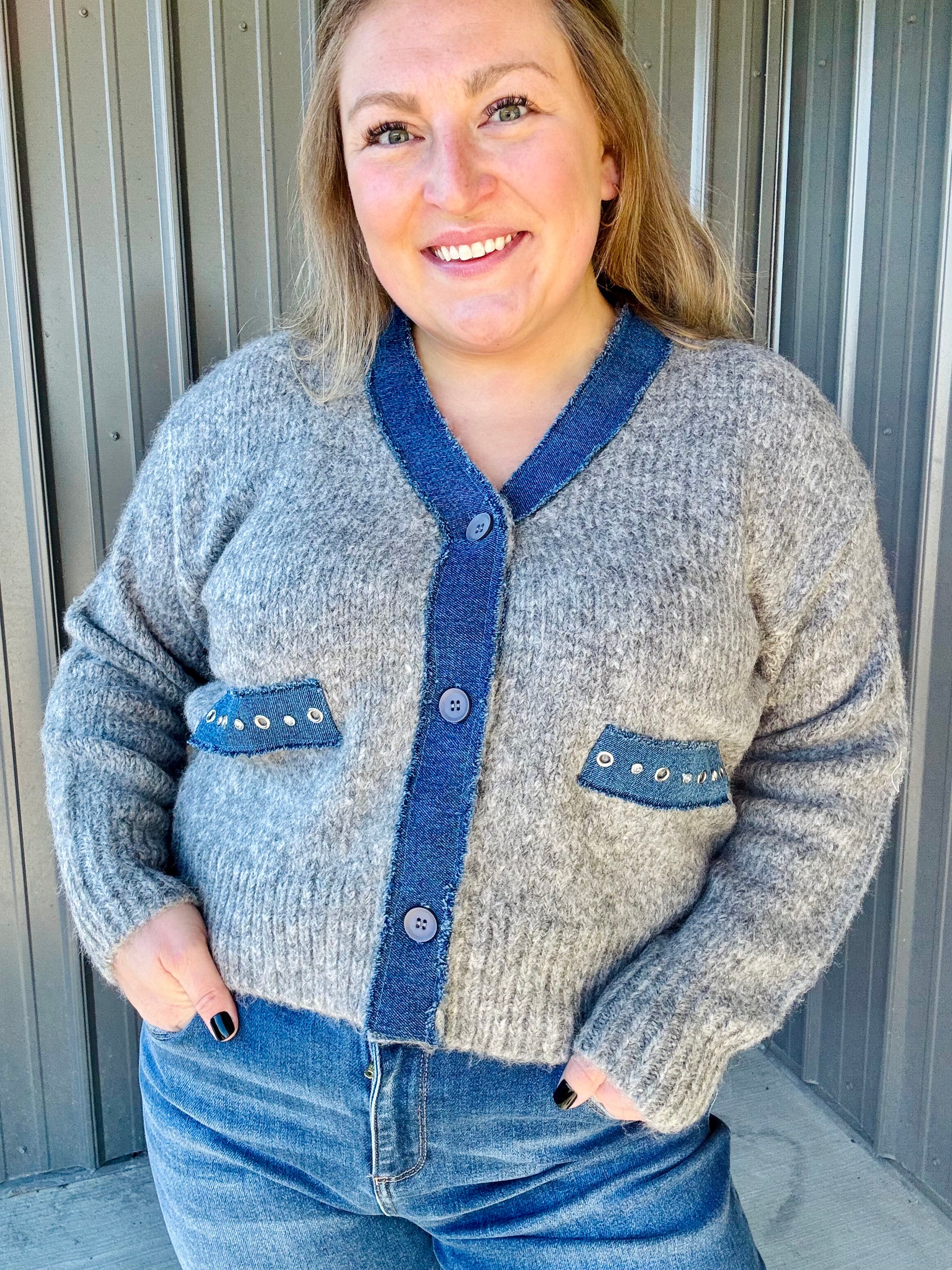 This one-size knit cardigan features a chic denim lapel and faux front pockets adorned with grommet and rhinestone accents, adding subtle sparkle and edge to a cozy layer. Perfect for elevating casual outfits with a unique mix of textures and details.
