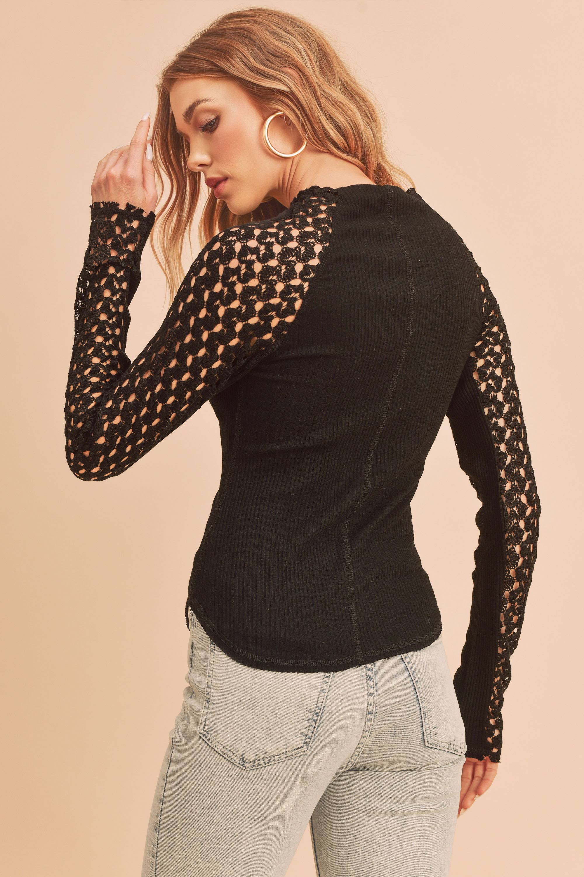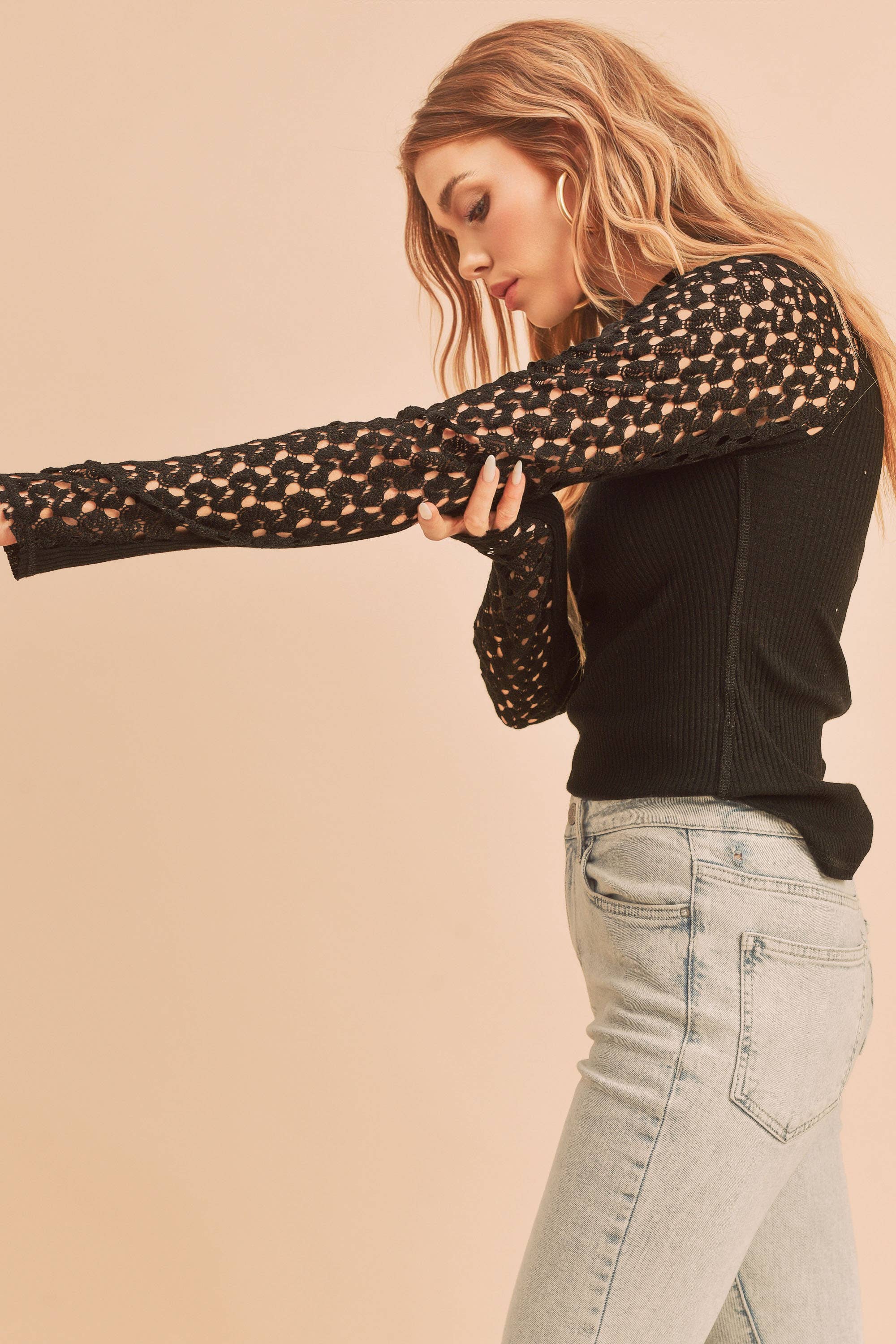The Suri Top is a versatile layering piece designed to elevate your everyday wardrobe. Its high-neck construction and long sleeves provide classic coverage, while delicate lace detailing on the sleeves adds an elegant touch. Perfect for building dimension into your outfits, this top transitions seamlessly from casual to polished looks.