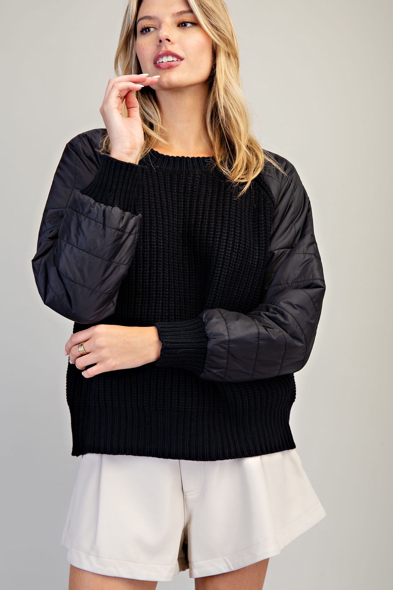 Effortless comfort meets contemporary style with this Long Sleeve Knit Sweater Top. The relaxed silhouette drapes beautifully while contrasting raglan sleeves in a distinct fabrication add visual interest and dimension. A classic rounded neckline pairs perfectly with ribbed cuffs and a ribbed bottom band for a polished, put-together look. Ideal for layering or wearing solo, this versatile piece transitions seamlessly from casual weekends to relaxed workdays.