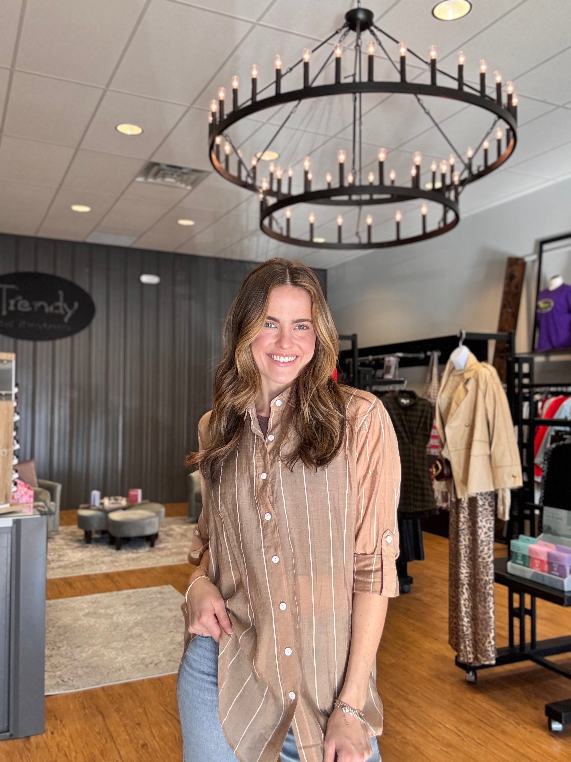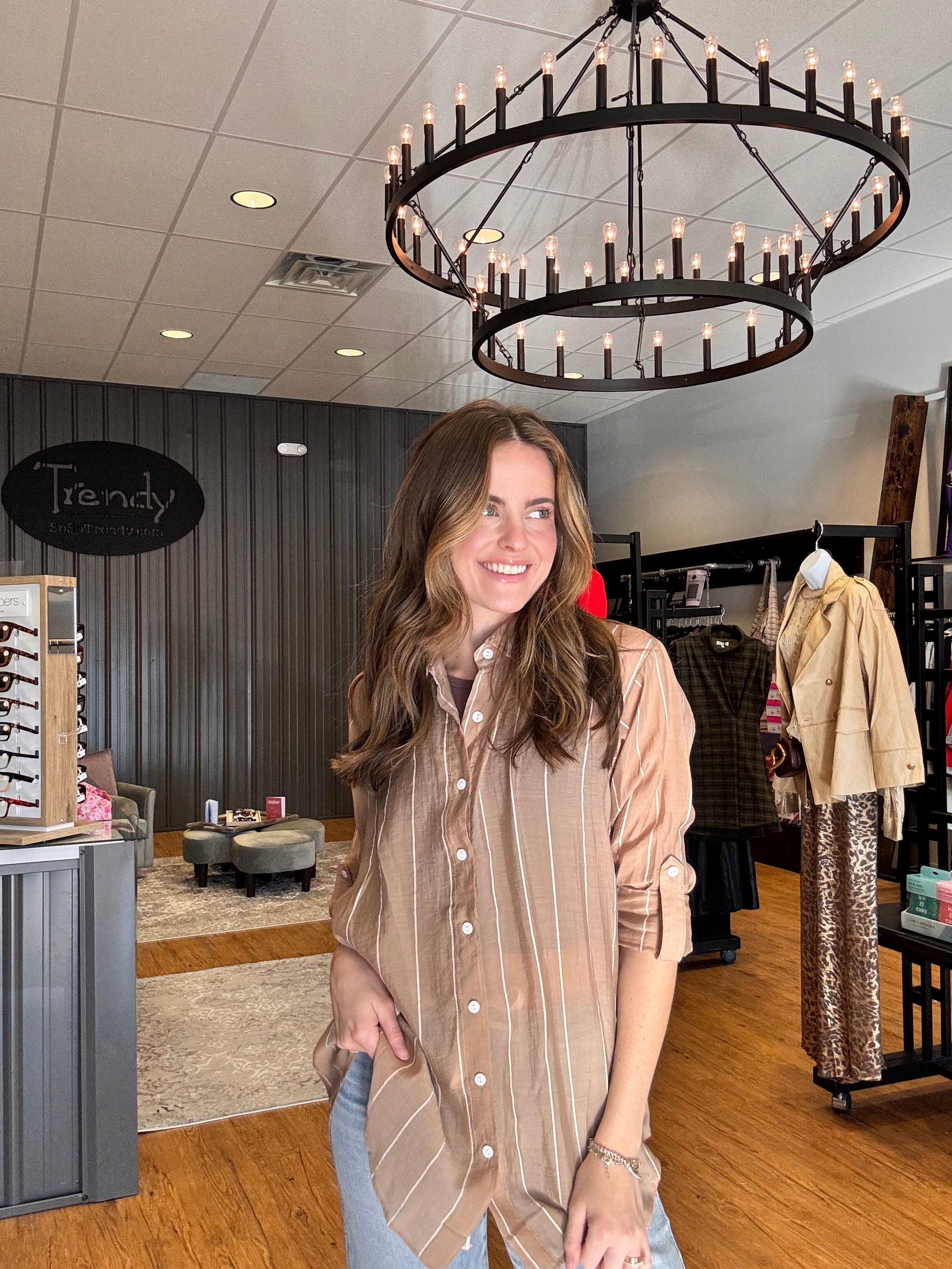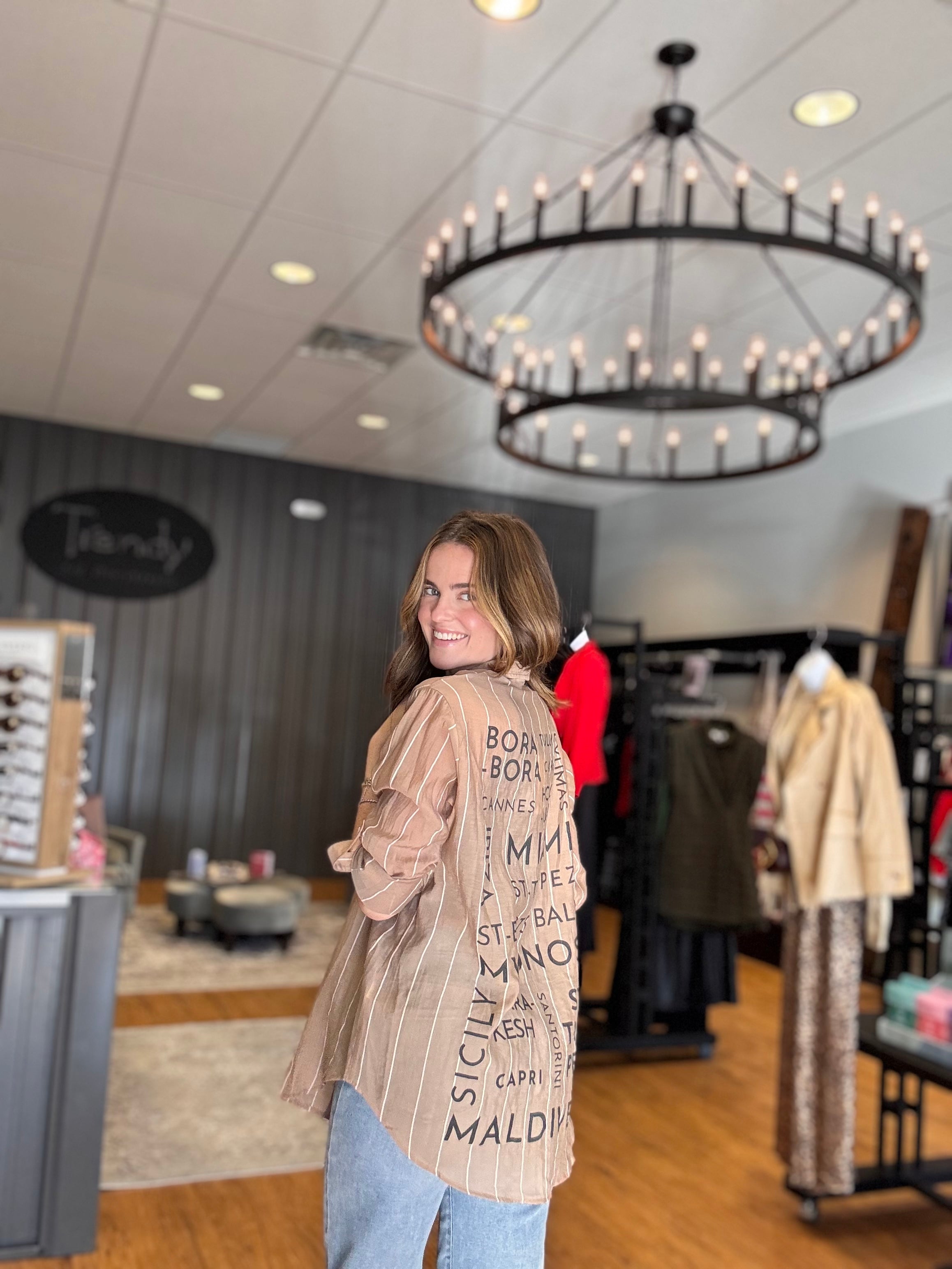 This lightweight oversized top features a classic striped button-front design with a relaxed collar, perfect for layering or wearing solo. The back showcases a graphic celebrating tropical vacation destinations, adding a fun travel-inspired touch to your everyday wardrobe. Ideal for casual outings, weekend getaways, or anyone who loves a breezy, comfortable fit with personality.