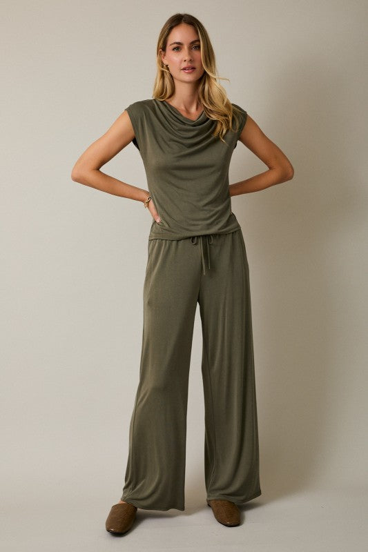 The Emma Cowl Neck Cap Sleeve Top is your new go-to piece for effortless style. Crafted from soft, luxurious fabric in a chic olive green, this top features a flattering cowl neckline and cute cap sleeves that work whether you're dressing it up for a night out or keeping it casual for everyday wear. Part of a coordinated set, it pairs perfectly with our matching Emma Draw String Wide Leg Pants (sold separately) for a polished, put-together look. Mix and match to create your ideal outfit!