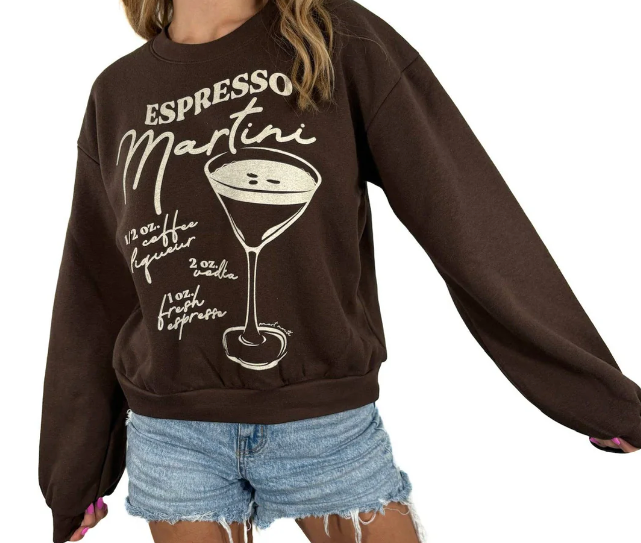 Elevate your casual wardrobe with this Espresso Martini Sweatshirt, a cozy women's fleece piece that combines comfort with contemporary style. Featuring a rich brown base adorned with cream graphics, this sweatshirt showcases a relaxed boxy fit and slightly cropped silhouette for a modern look. The standout balloon sleeves add a playful, fashion-forward touch that works beautifully with everything from jeans to tailored trousers. Perfect for coffee runs, weekend hangouts, or layering over your favorite basics.