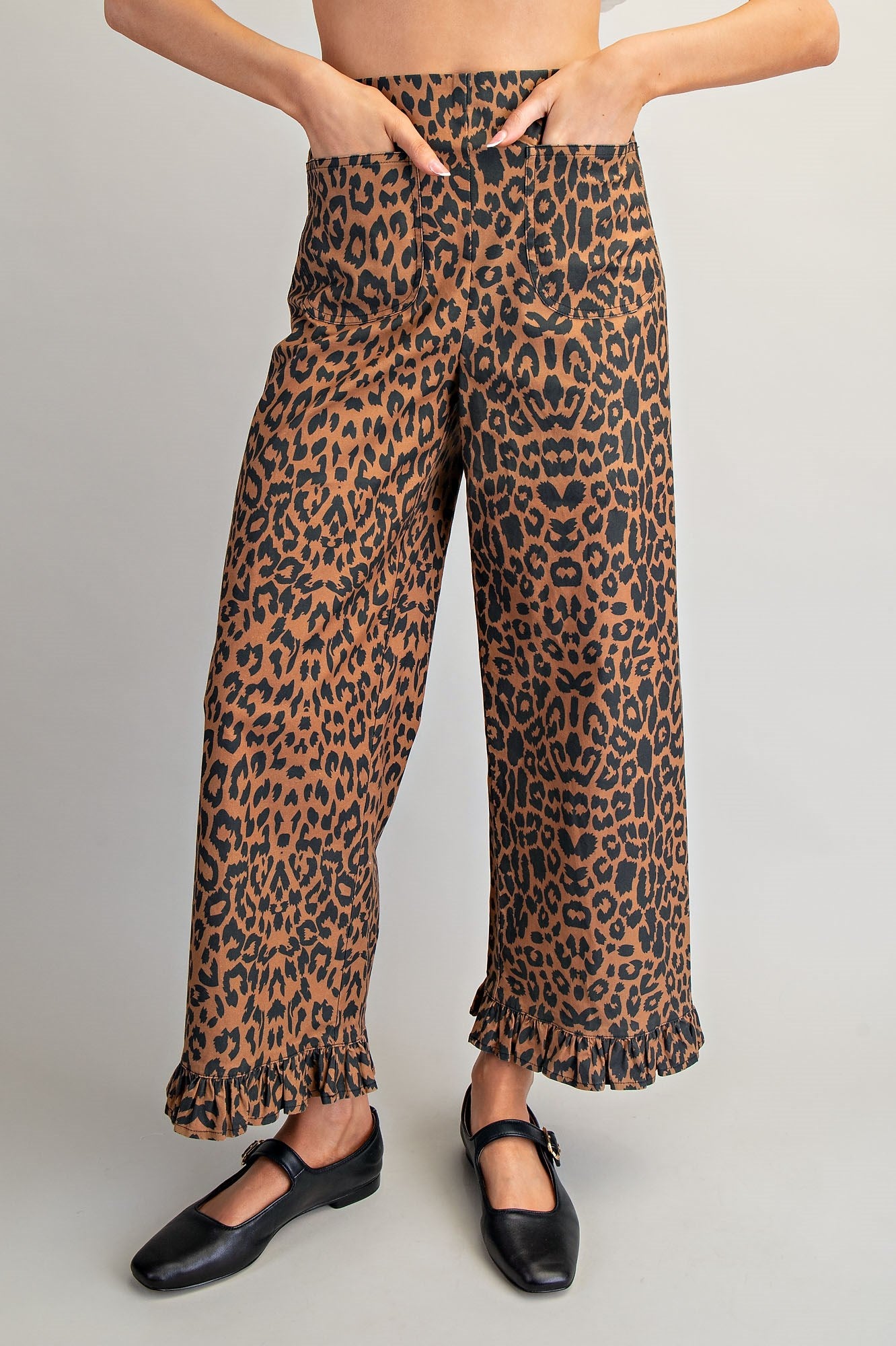 Elevate your casual wardrobe with these eye-catching leopard print pants. The high-rise waist provides a flattering fit, while the straight-leg silhouette offers timeless versatility. Practical front patch pockets keep essentials within reach, and a back zipper closure adds modern functionality. Ruffled raw edge hems deliver an effortlessly relaxed vibe with undeniable style. Perfect for mixing bold prints into your everyday rotation.
