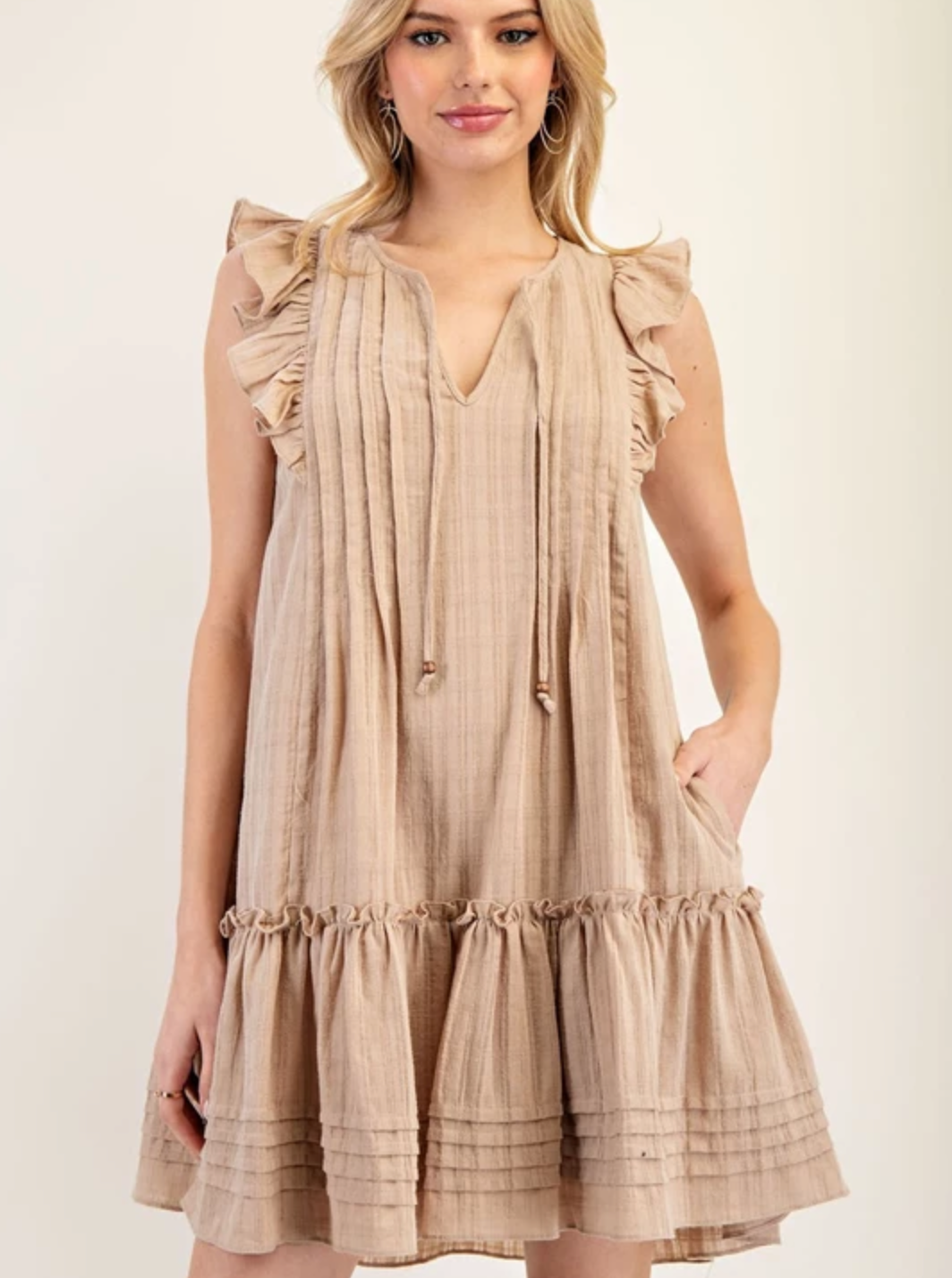 Embrace effortless elegance with this ruffle sleeve dress. Featuring delicate tiered layers and charming ruffle details on the hem and sleeves, this dress adds a playful yet sophisticated touch to your wardrobe. The flattering tie-front design enhances your silhouette, making it perfect for both casual outings and special occasions. Stay comfortable and stylish all day long with this versatile, eye-catching dress.