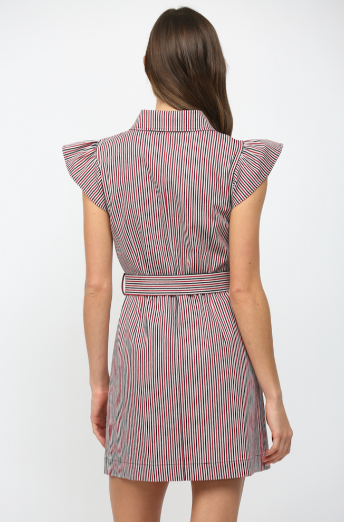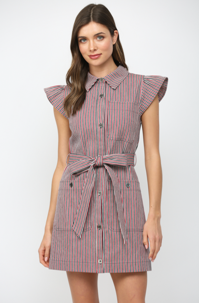 Our button down dress with ruffle sleeve and waist sash is a playful yet polished staple. Designed with a classic collared neckline and full button-front closure, this striped mini dress features soft ruffle sleeves for a feminine touch. The removable waist sash cinches the silhouette for a flattering fit, while functional pockets add everyday ease. Perfect for brunch, workdays, or weekend outings.